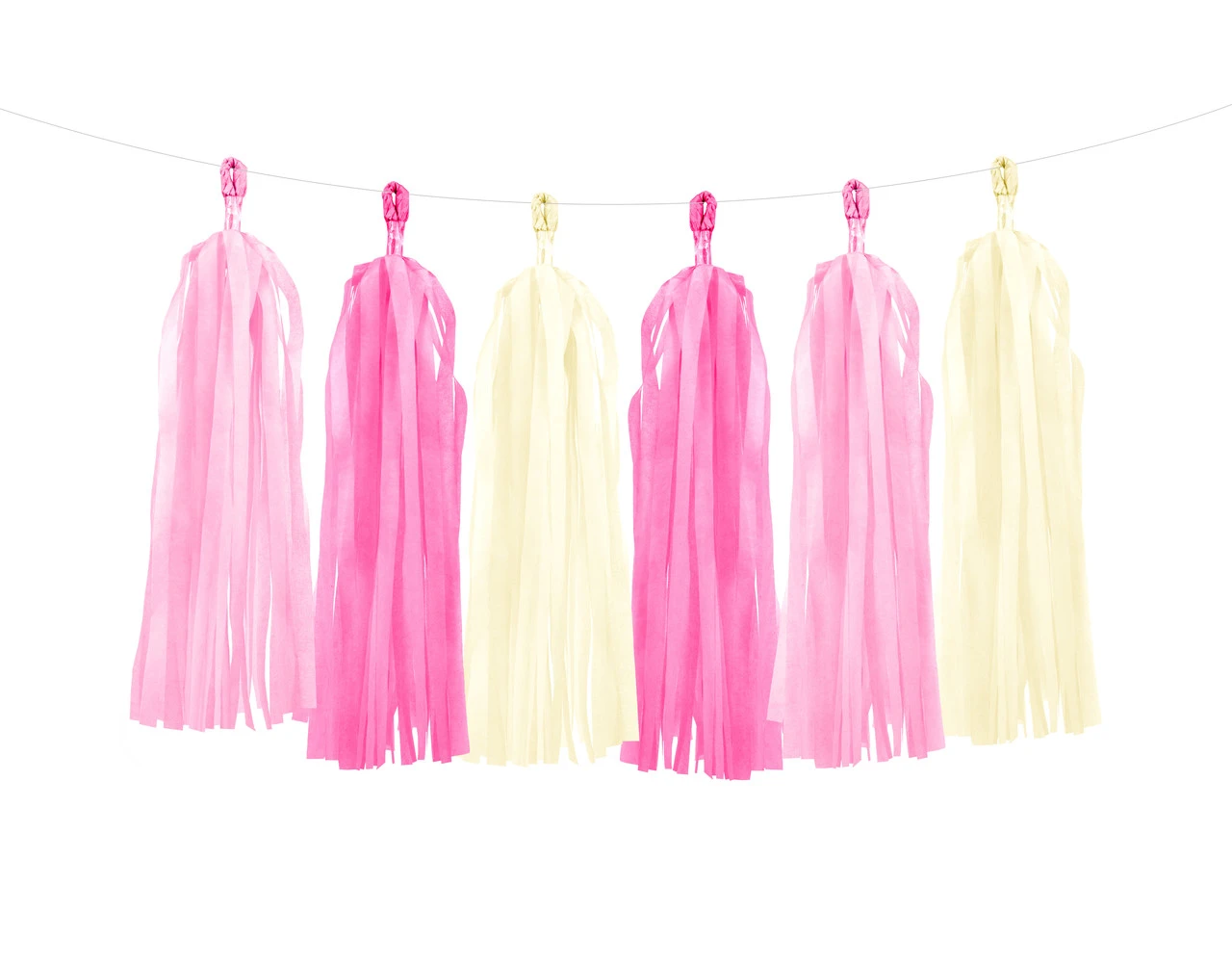 Inhoud: Tassel slinger, doe het zelf, set bevat 12 kwasten (room, roze en donker roze, 4 stuks per stuk) en ca. 2 m van de witte touw, maten na het monteren: hoogte ca. 30 cm, lengte ca. 1,5 m.