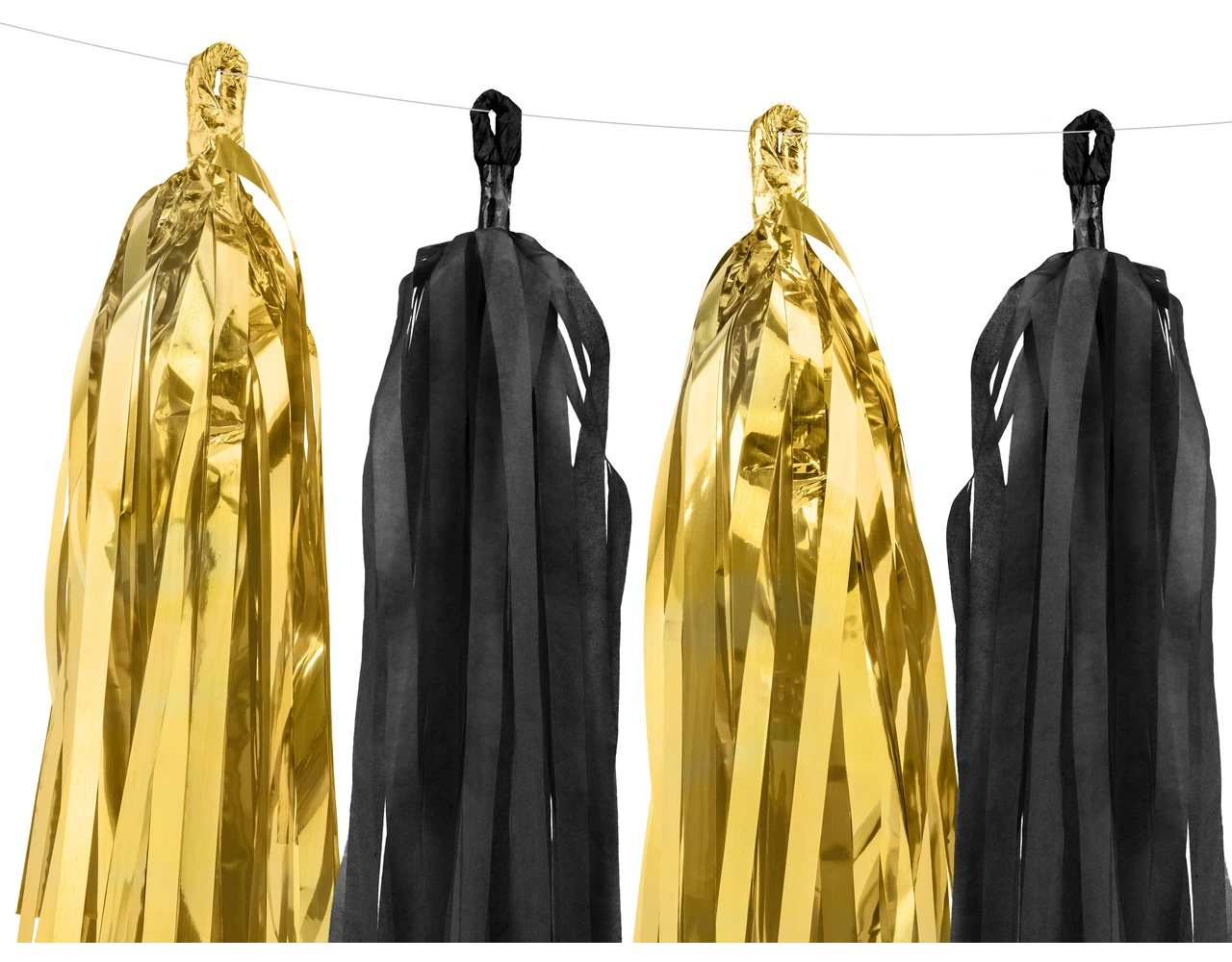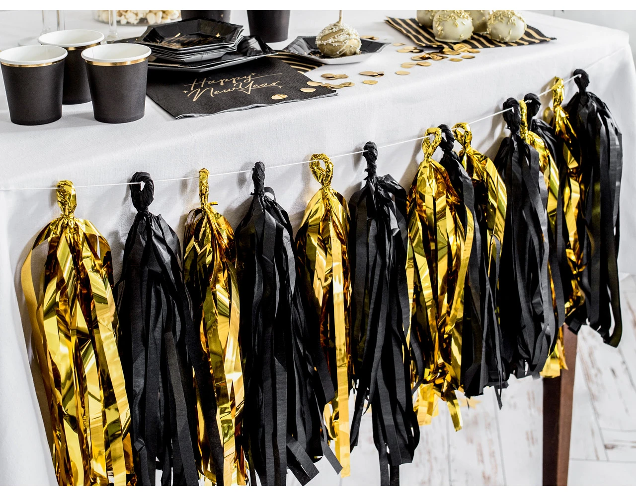 Inhoud: Tassel slinger, doe het zelf, set bevat 12 kwasten (mirror goud, zwart, 6 stuks per stuk) en ca. 2 m van de witte touw, maten na het monteren: hoogte ca. 30 cm, lengte ca. 1,5 m.