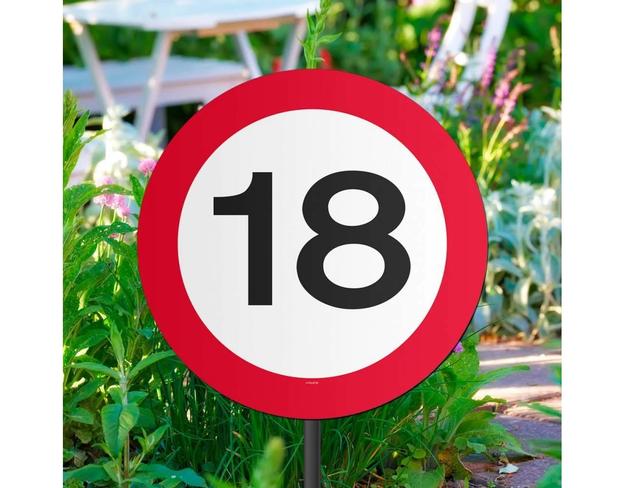 18 Jaar Verkeersbord Tuinbord. Inhoud: 1 bordje. Bijvoorbeeld te gebruiken tijdens de volgende feestgelegenheid/feestgelegenheden: Verjaardag, Jubileum. Diameter van tuinbord: 26 cm. Lengte stok: 48 cm. Het artikel is gemaakt van plastic.