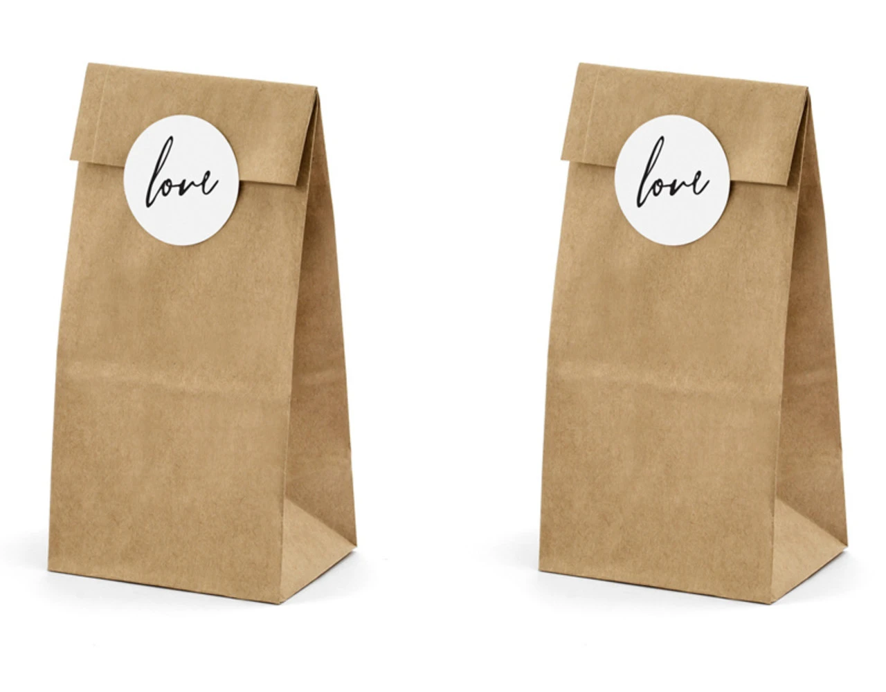 Traktatiezakjes, gemaakt van kraftpapier, met 6 witte stickers Love, afmetingen na assemblage ca. 8x18x6 cm.