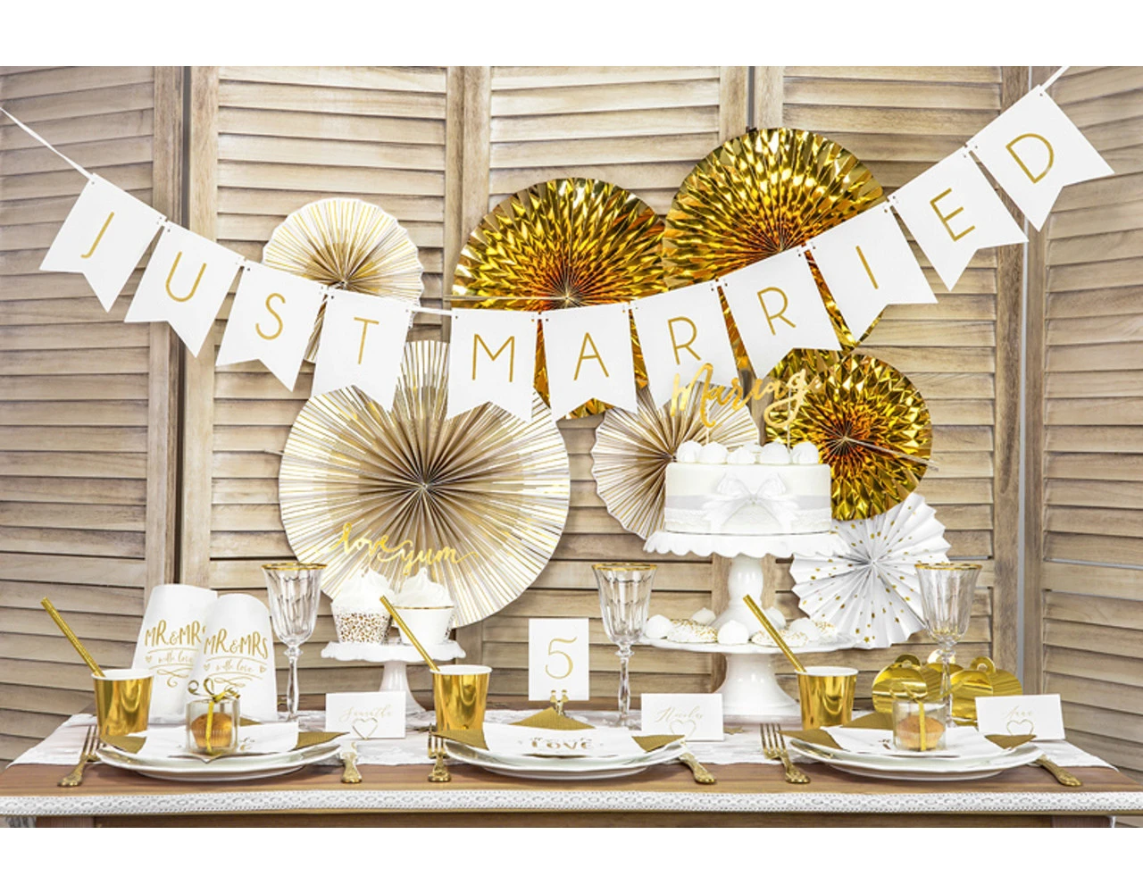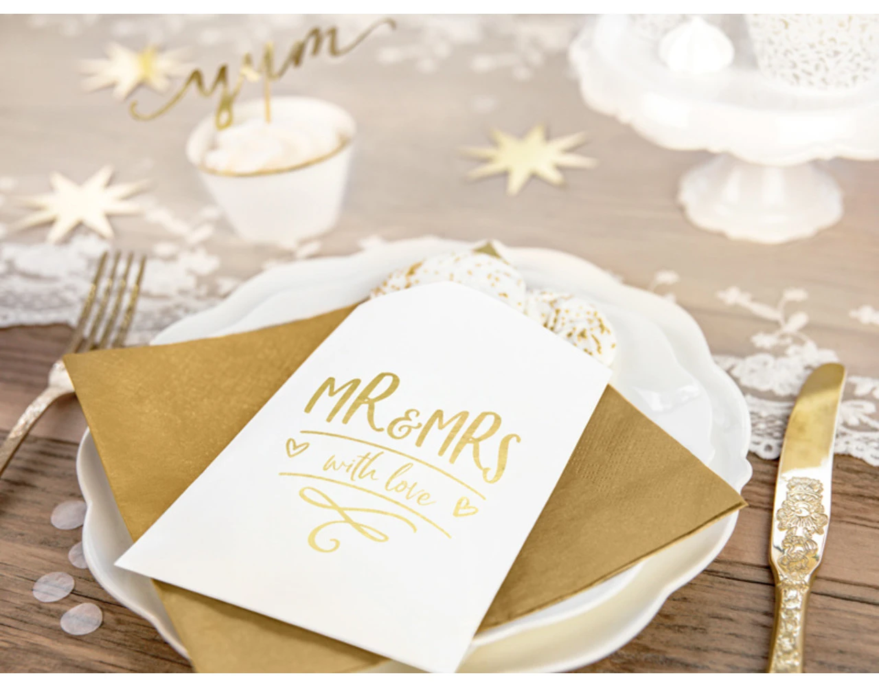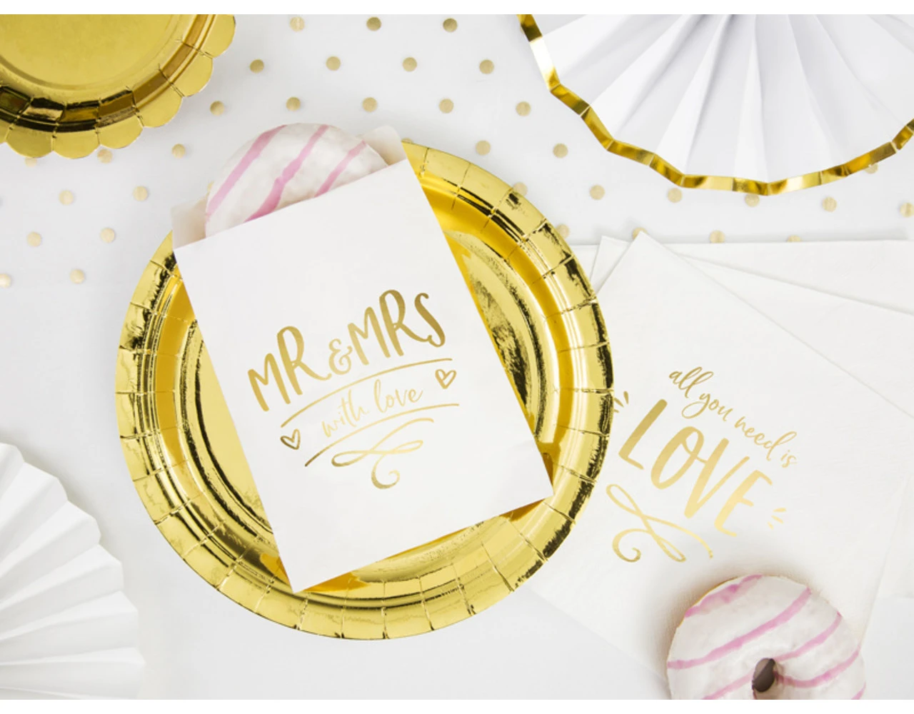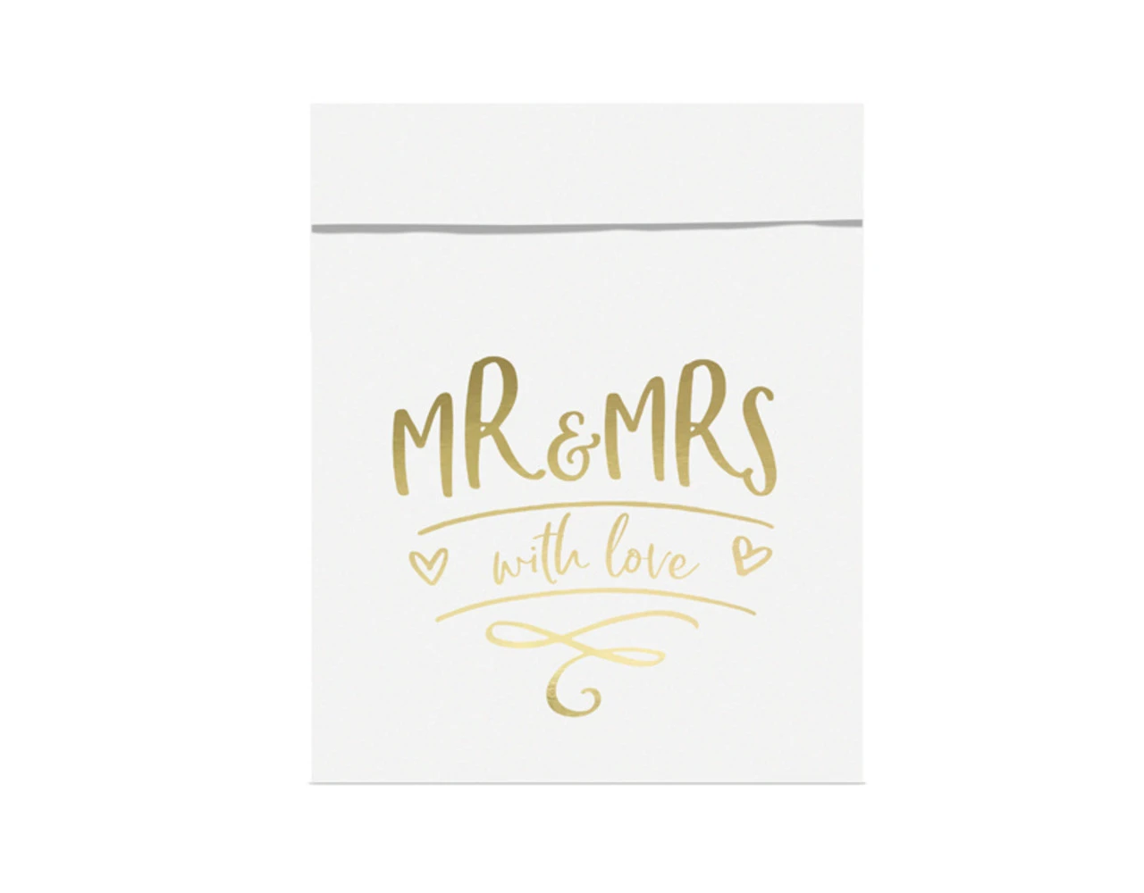Papieren traktatiezakjes Mr&Mrs, set bestaat uit 6 zakjes met spiegelgoud print, afmeting na montage ca. 13 cm x 16,5 cm.