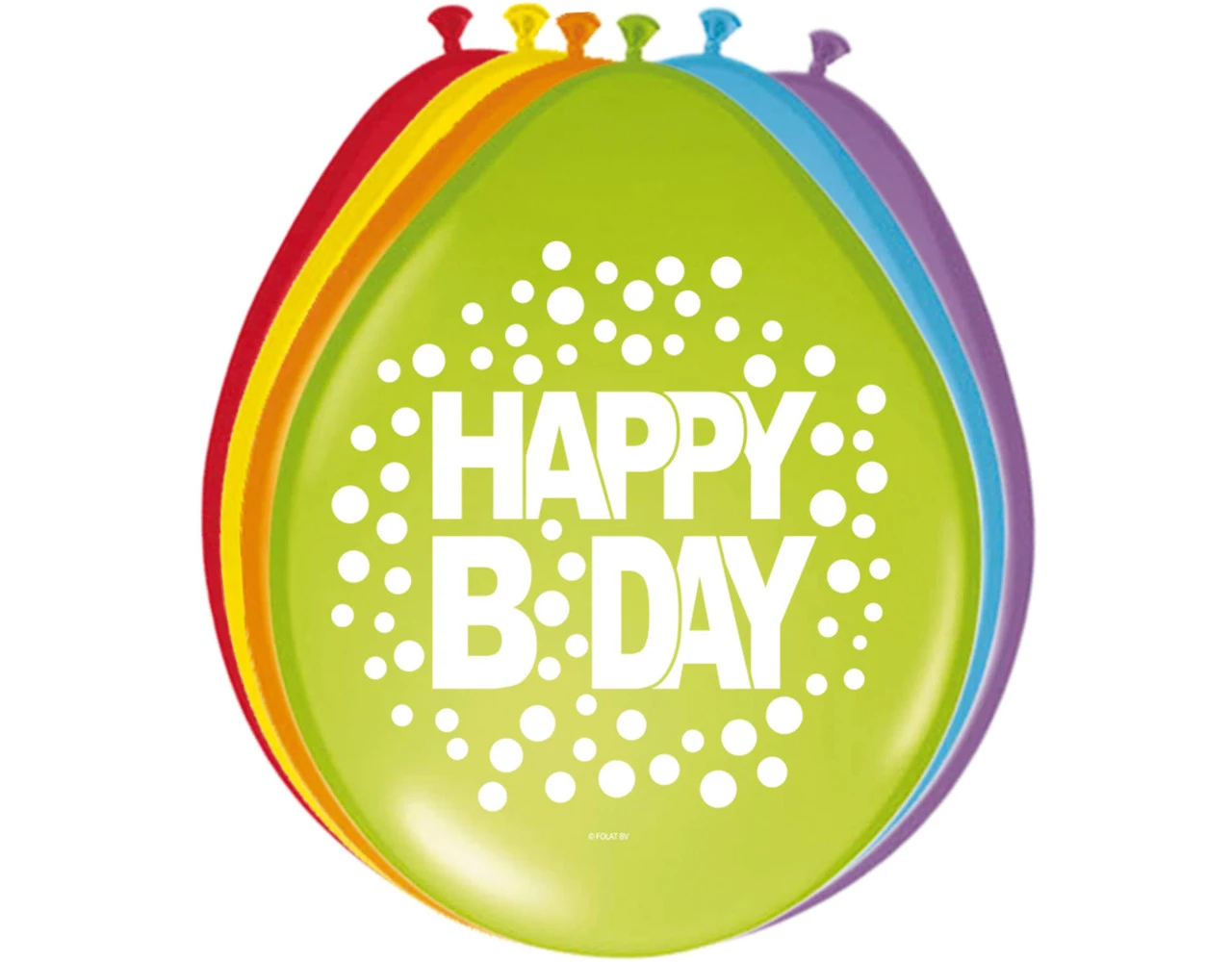 Happy Bday Stippen Ballonnen 30 cm – 8 stuks. Inhoud: 8 latex ballonnen. Bijvoorbeeld te gebruiken tijdens de volgende feestgelegenheid/feestgelegenheden: verjaardag, kinderfeestje. Elke ballon is 12 inch/30 cm. Het artikel is gemaakt van latex.