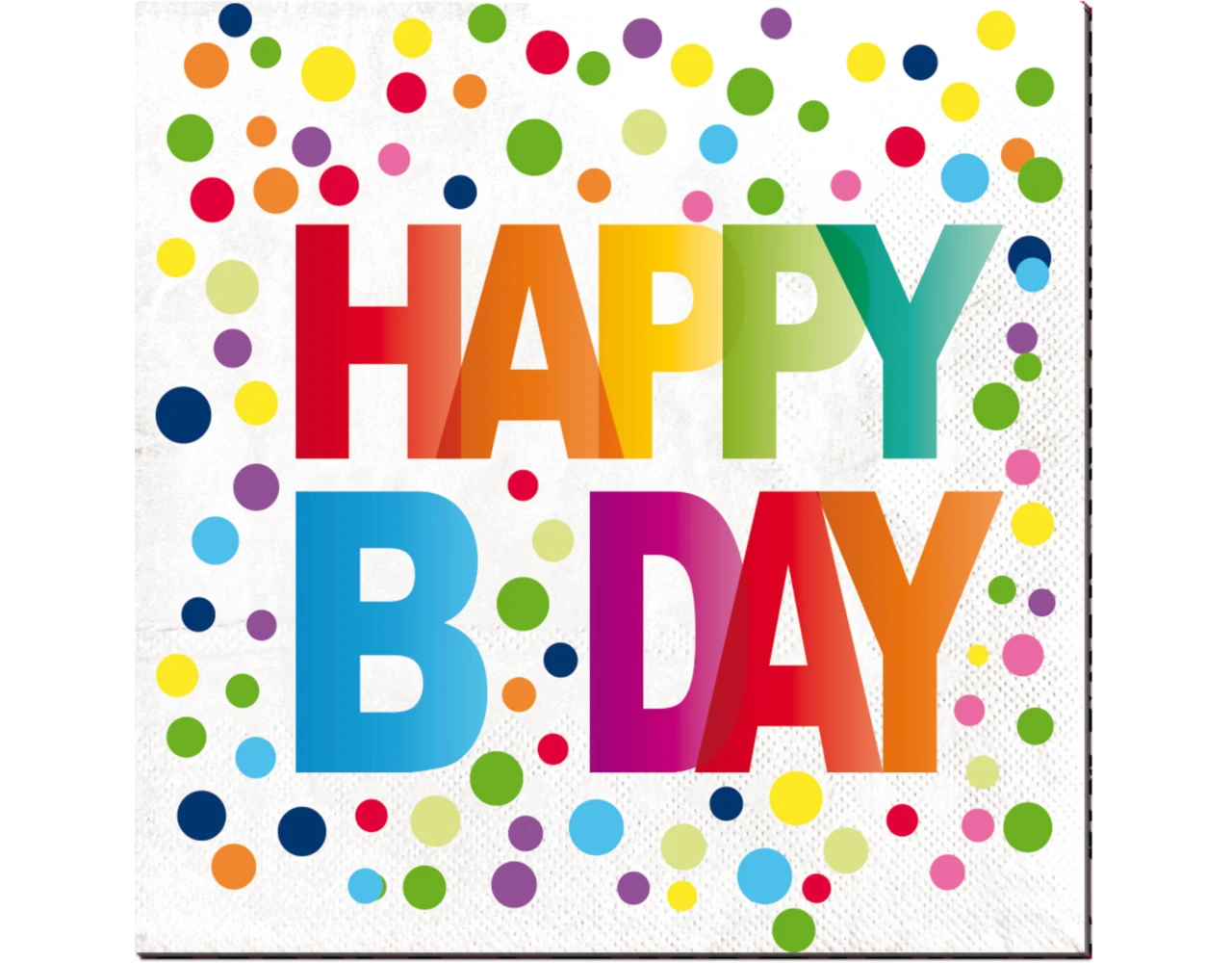 Happy Bday Stippen Servetten 33x33cm – 20 stuks. Inhoud: 20 servetten. Kleur: Meerkleurig. Productthema: Rainbow Dots. Bijvoorbeeld te gebruiken tijdens de volgende feestgelegenheid/feestgelegenheden: verjaardag, kinderfeestje. Een servet is 33x33cm. Het artikel is gemaakt van papier.
