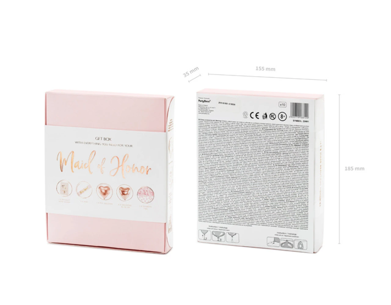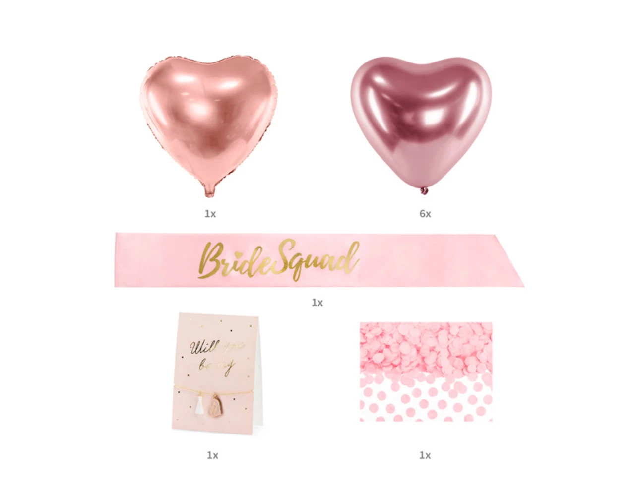 Bruidsmeisjesfeestdoos, mix van kleuren, set bevat: sjerp (1 stuk), kaart met armband (1 stuk), folieballon (1 stuk), latex ballonnen (rosŽgoud, 6 stuks) en confetti (15 g).