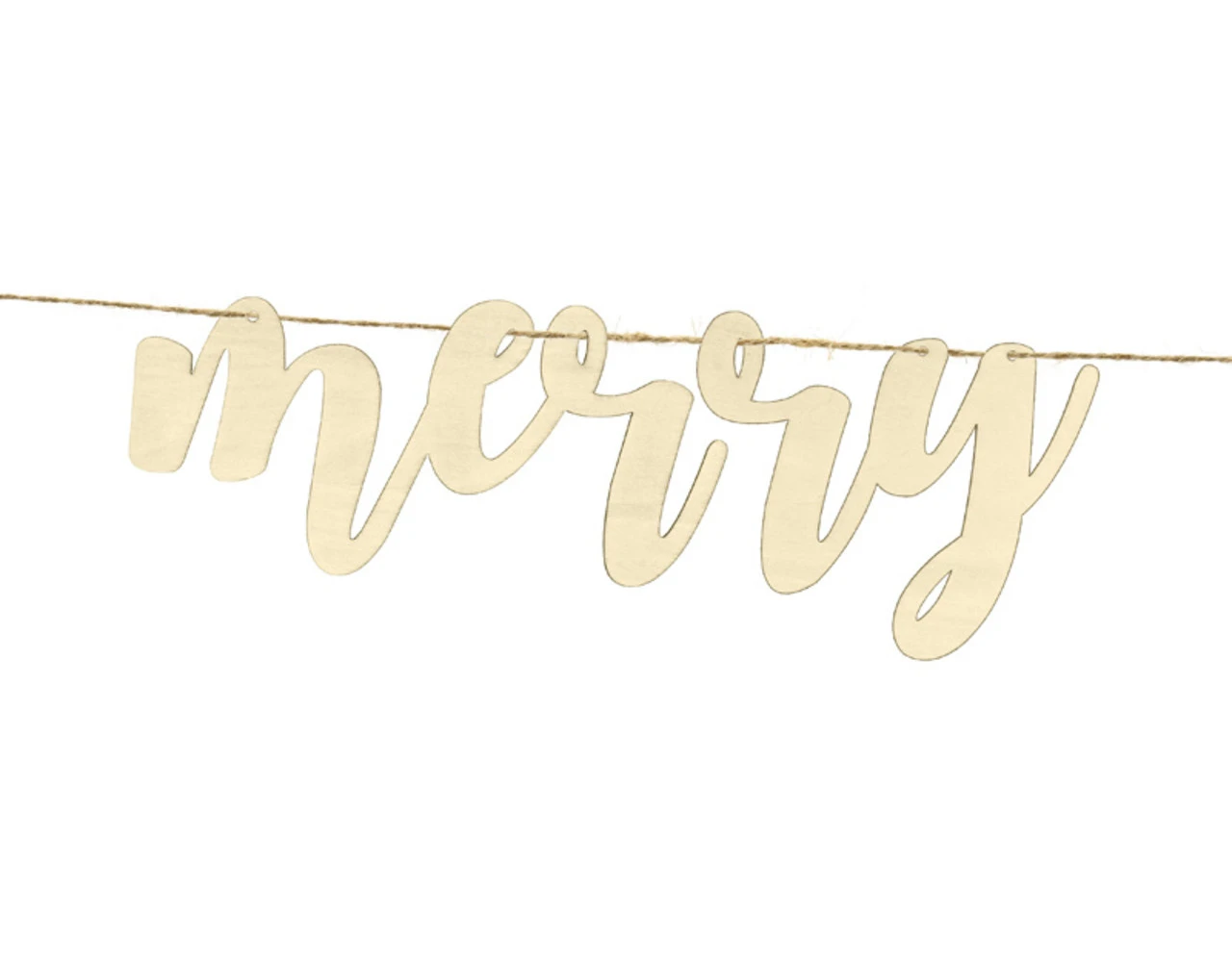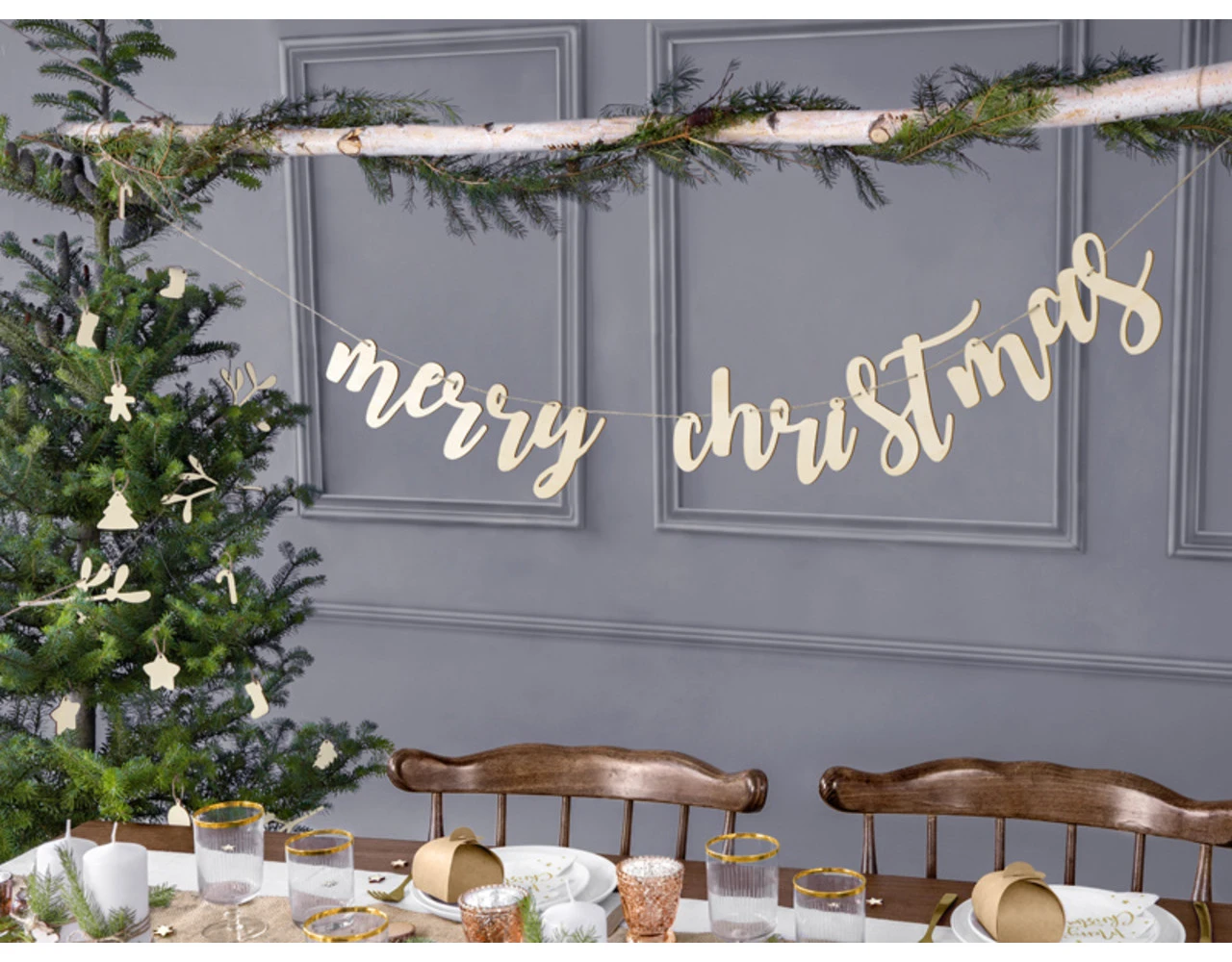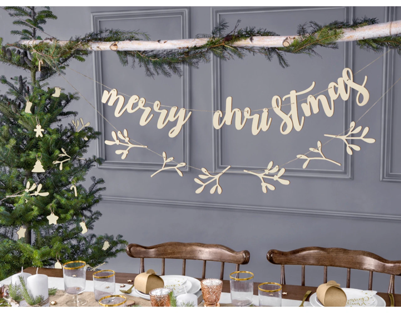 Banner Merry Christmas van hout, set bevat opschriften en ca. 2 m linnen twijn, afmeting na montage: lengte ca. 87 cm, hoogte ca. 17cm.