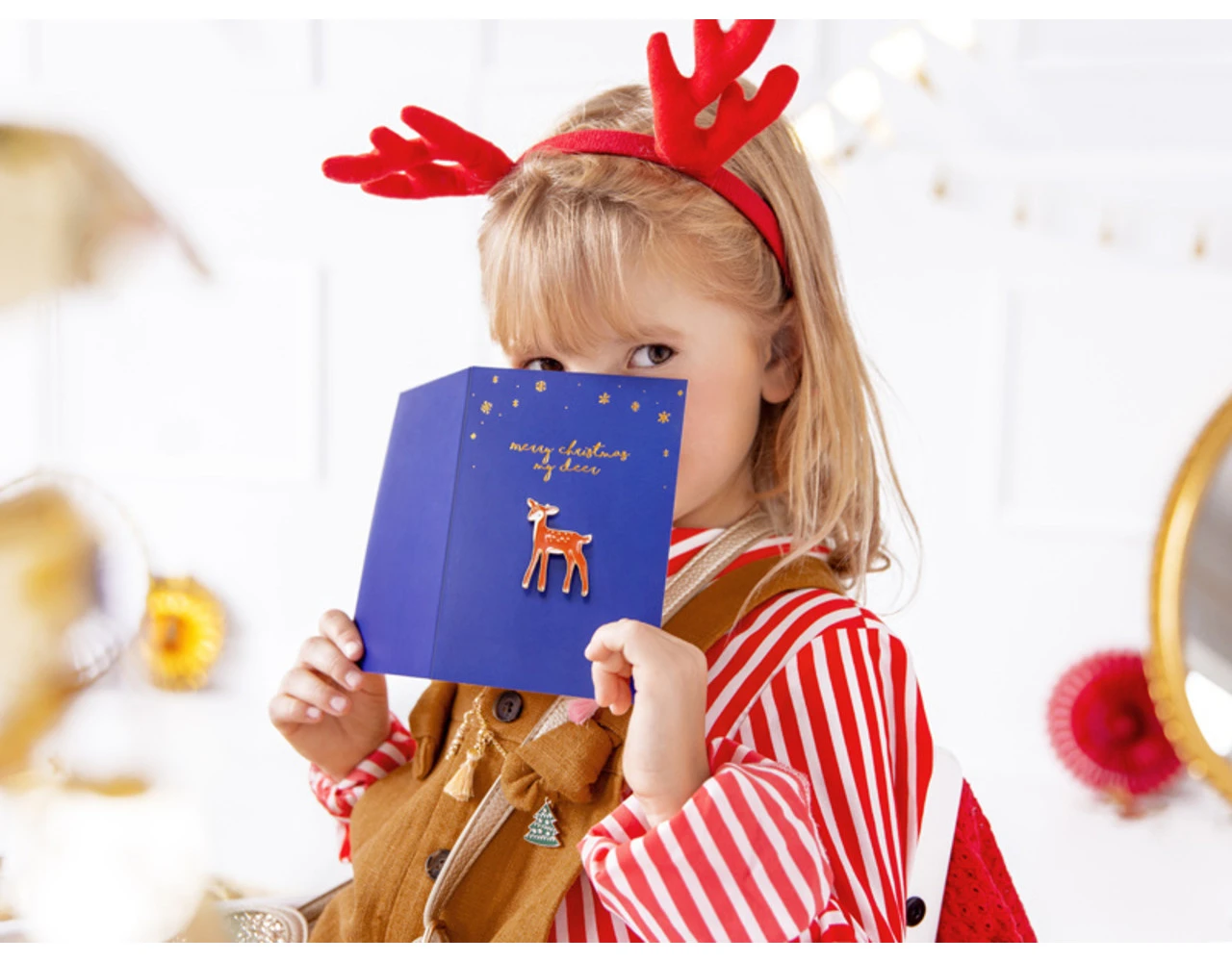 Papieren kaart in marineblauwe kleur met goudmetallic opdruk met emailspeld in de vorm van een hert en witte envelop met goudmetallic opdruk, afmeting kaart ca. 10,5 x 14,8 cm, afmeting emailspeld ca. 3 x 4,5 cm.