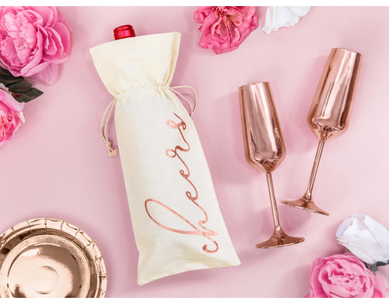 Wijntas van katoen met rosŽgouden opschrift Cheers, afmeting ca. 15,5 x 36 cm.