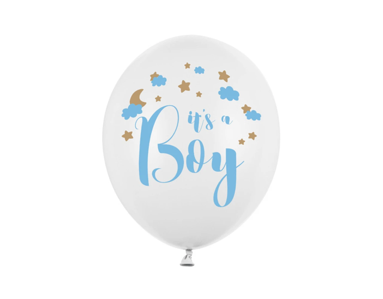 Sterke Ballonnen, Pastel Puur Wit met hemelsblauw-gouden dubbelzijdige opdruk It’s a Boy, diameter 30 cm.