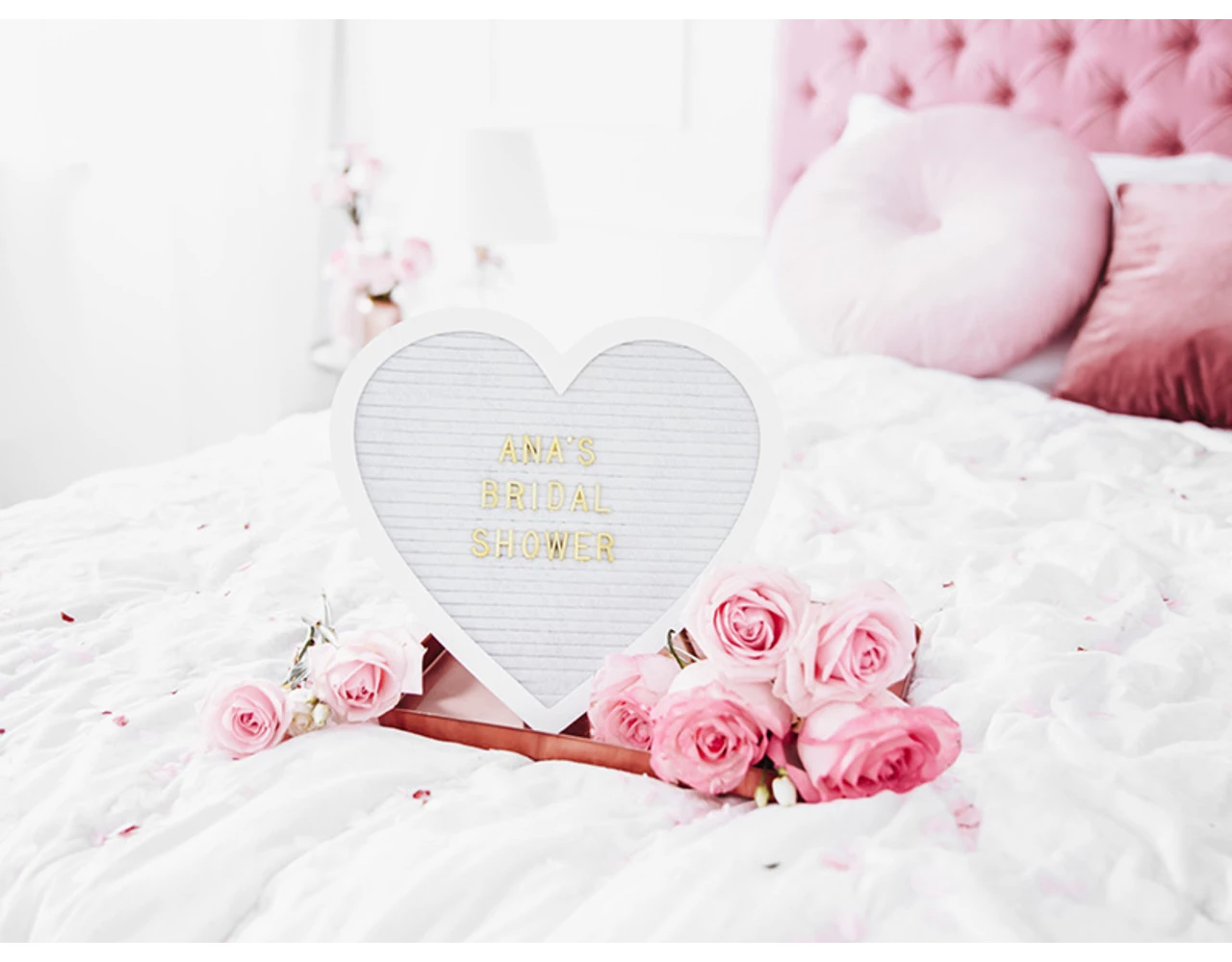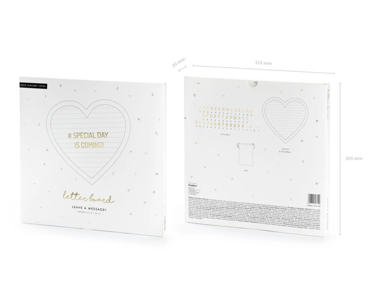 Letterbord van vilt in de vorm van een hart in een houten frame in witte kleur. Set bestaat uit een bord, een set letters en cijfers en een katoenen zakje. Afmetingen van het bord ca. 31 x 29 cm.