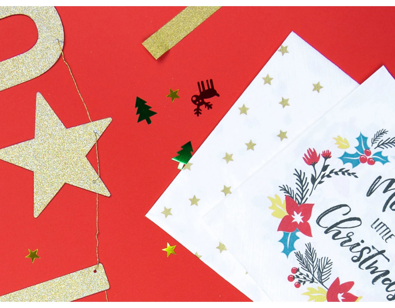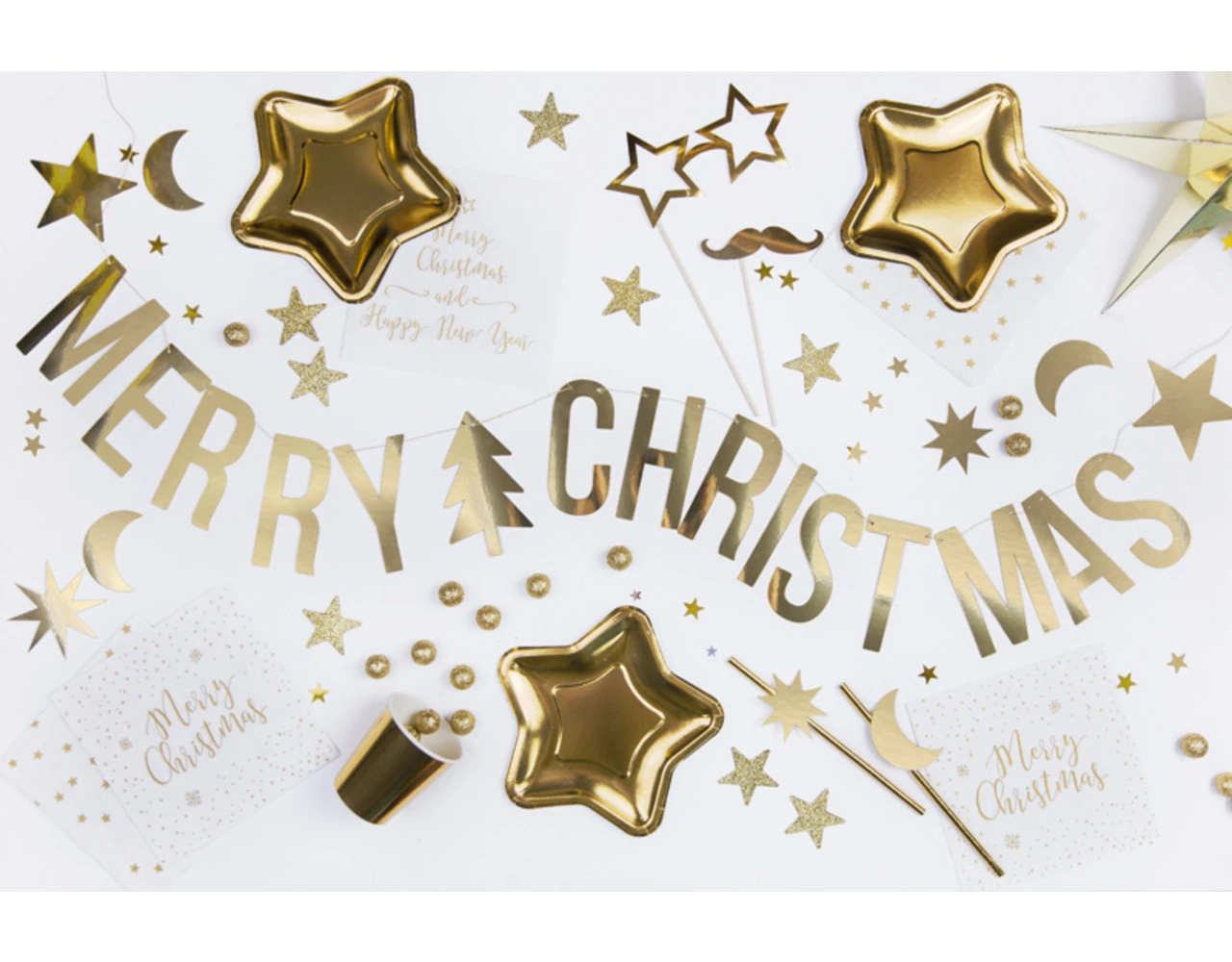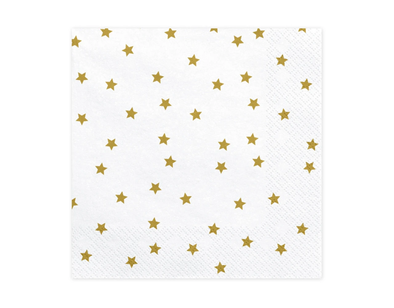 Papieren servetten Stars, wit met goudopdruk, formaat na uitvouwen ca. 33 x 33 cm, formaat na assembleren ca. 16,5 x 16,5 cm.