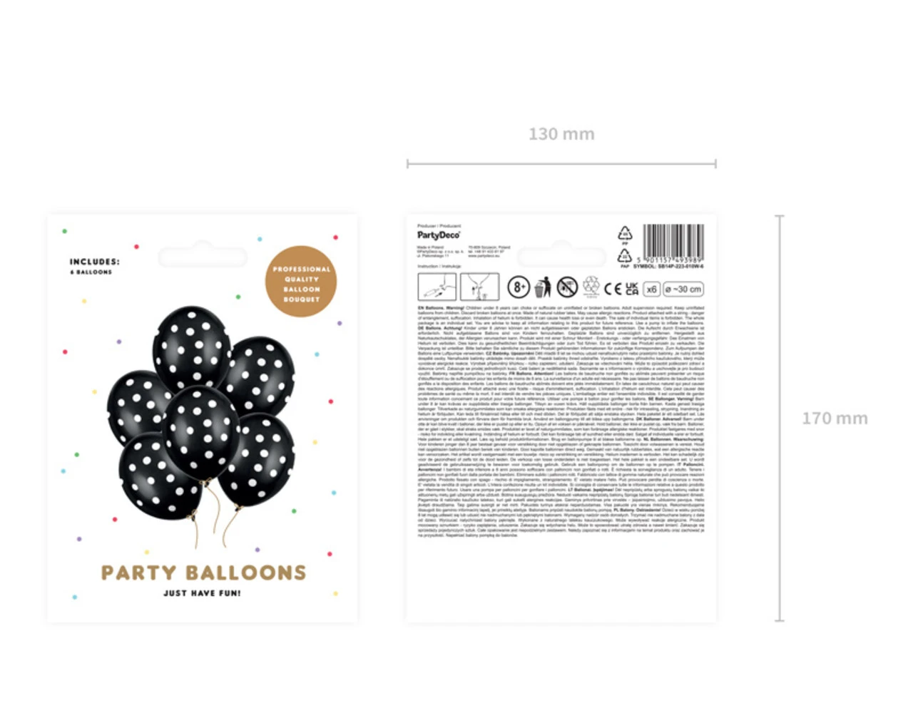 Sterke Ballonnen Stippen, Pastel Zwart met wit, vijfzijdige opdruk, diameter 30 centimeter.